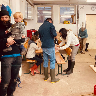 Vormittags waren wir 14 Personen, sodass wir wie in einer Produktionsstraße fertigen konnten: Jede und jeder hatte seine Aufgabe, auch die Kinder bauten fleißig mit. Wie am Fließband wurde ein Kasten nach dem anderen fertig.