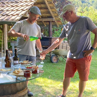 Ingo Huber kredenzte einen Apfelwein, den er aus den Äpfeln der nahegelegenen Wiese gekeltet hatte. Er ließ uns die Moste aus verschiedenen Jahrgängen vergleichen. Besonders erfrischend war der Apfelwein mit Kräutern wie Zitronenmelisse und Rosmarin. Es folgten bernsteinfarbene bis gelbe Apfelweine und Moste mit mehr Kohlensäure, vergleichbar mit einem französischen Cidre aus der Normandie. Zudem gab es die Gelegenheit, „Sidra“ aus den spanischen Regionen Asturien und Baskenland zu probieren, der auf traditionelle spanische Art von hoch oben eingeschenkt und langsam getrunken wurde.