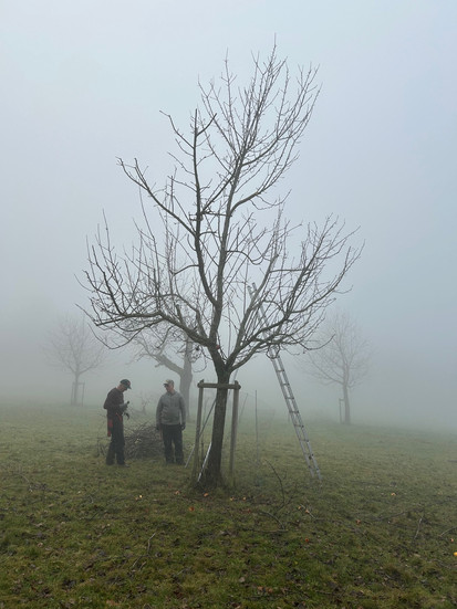 Auf unserem Programm standen vorwiegend 10 – 15-jährige Jungbäume unterhalb der Berghauser Kapelle in Richtung Gaisbühl. Um uns gegenseitig zu unterstützen und den fachlichen Austausch zu fördern, arbeiteten wir in Zweierteams.
